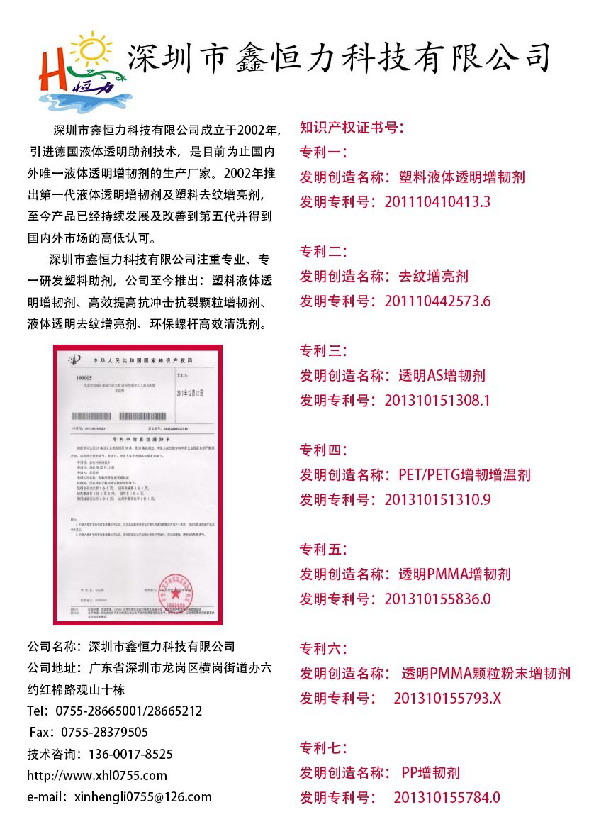 深圳市鑫恒力科技有限公司成立于2002年,引进了德国液体透明添加剂技术。到目前为止,它是国内外液体透明增韧剂的制造商.2002年,第一代液体透明增韧剂和塑料在纹增亮剂上市。到目前为止,该产品早已不停开发和改进到第五代,并获得了国内外市场的高度认可。